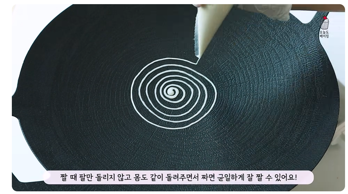 약불로 예열한 팬에 반죽을 중앙에서 바깥 방향으로 원을 그리듯이 얇게 짜줍니다.